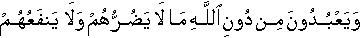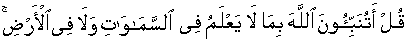 25:55] and they worship/exhibit allegiance and subservience to some other than Allah that neither causes them any infliction nor that causes them any benefit. And they tell people, "These are our intercessors with Allah" You, the Messenger [Sal'lallaa'hoalaih'wa'salam], question them, "Do you people inform/give news to Allah about that He does not know neither in the Skies and nor in the Earth?" [Same pronouncement in same words in