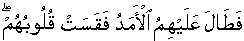 • Thereon the time interval lengthened upon them whereby their hearts became hardened/dense/stuck to one place/immovable [from the  conjectural myths/stories/notions/hopes made popular]