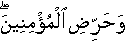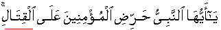 Root: ح ر ض Words from this Root in the Grand Qur'aan: a) Total occurrences: 3 b) No of constructions: 2 Noun: 1; Verb: 1 Recurrence: 2 [Form-II] The basic perception infolded in the Root is that of a dissolved or emaciated state by disease or excessive grief, or by excessive love leading one to the point of death or endangering life. Hence, it is employed to urge, excite, incite, instigate; and rouse to ardour to avert the threat to life. A dissolved and emaciated state puts the energy and life retaining body heat to a lower level. Exciting and inciting creates an urge for recovery and energizes the body heat and energy. When war is imposed upon believers by the disbelievers, it not only puts their life at stake but threatens even their real life in the hereafter since in case of subjugation their belief and code of conduct will also be at jeopardy. The Messenger [Sal'lallaa'hoalaih'wa'salam] is advised: