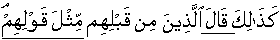A verbal statement is compared with a verbal statement of earlier people. This is مِثْلَ -simile. تَشَابَهَتْ: It is Form-VI perfect Verb, third person, singular, feminine. Its equivalent Imperfect Verb is تَتَشَابَهُ from which Active Participle: مُتَشَابِهَاتٌ is derived. The Subject of Verb is: قُلُوبُهُمْ their hearts. It is obvious that the verb does not denote real-physical similarity of hearts of these people with those of earlier people, but the resemblance is ideal, abstract; what is concealed therein, psyche and thoughts. مُتَشَابِهَاتٌ : These are the performers of a job signified by the verb from which it is derived; they relate two things by comparison, one known and the other unknown. This is what we call in English "Metaphor". Metaphors are used to help us understand the unknown because we use what we know in comparison with something we don't know to get a better understanding of the unknown. The purpose of quoting similes is to explain and elaborate information facilitating the reader to conveniently perceive and understand it comprehensively. Metaphors are employed to let reader have a general idea and perception about an unknown abstract reality and phenomenon. Using similes and metaphors does not mean that the concept, abstract reality and phenomenon highlighted through them were earlier vague and undefined in absolute sense. Level of information, intellect and understanding of men varies. Explanation and elaboration through Similes and metaphors help make perceptions explicit. However, any informative statement whether conveyed in plain manner or highlighted through metaphors could be baffling for someone. It might prove too difficult or complicated for somebody to understand, solve, or deal with, causing a feeling of confusion or helplessness. People do feign confusion and puzzlement: Note: [ Metaphor comes from the Greek word meaning "I carry with"; and is a rhetorical figure used to "carry" the meaning of a word into another. Allegory comes from the Greek (to speak something different), as it expresses a concept using a different word. Contrary to metaphor, however, the shift of the meaning is often deep and hidden. Grand Qur'aan is guidance and the Guide. The Book that serves as Guide, like genetic code in DNA, does not adopt allegorical approach. تَشَابَهَتْ does not connote allegory.]