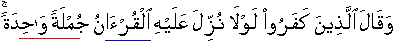 And We have caused it: Grand Qur'aan recited distinctly making every syllable, vowel, pause prominent in the manner of excellently arranged flow of thread structuring the most beautiful compact web. [25:32]