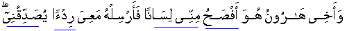 And my brother Haroon; he is more fluent with regard to verbal arguing/speaking ability. Therefore, You do send him with me as supporter, he will second my word affirming—[also read with 20:29-32]