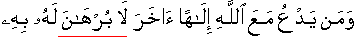 • And if someone calls along with Allah the Exalted any other as iela'aha: godhead;  there is absolutely no substantive evidence and argument for him in support of his conjectural contention,