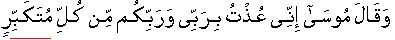 • And Mūsā [alai'his'slaam] said, "I take refuge with my Sustainer Lord and Sustainer Lord of you people from each and every arrogant who has made himself obsessed with feel of grandeur;