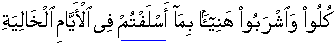 • "You people eat and drink with satisfaction because of that which you did beforehand in the days gone by." [69:24]
