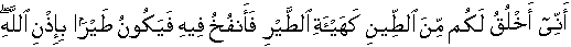 The evidence is that I cast-sculpt bird-like models before you people using muddy clay. Thereat, I blow therein, whereby they take existence as living birds by the explicit will of Allah the Exalted.