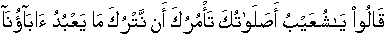 They said: "O Sho'aib! does your Sa'laat: time bound protocol of servitude and allegiance for Allah commands you that we might leave what our forefathers used to worship and were allegiant to?