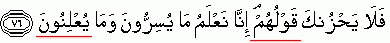 "For that you {O Messenger} should not feel grieved with their utterances of mouth. We certainly know what they secretly say and what they say publicly/openly. {Refer 36:76}