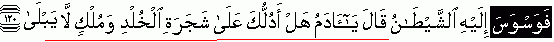 "Then he created confusion for him by saying "O Adam! May I lead you to the tree of eternity and to a kingdom that never falls/decays?" {Refer 20:120} وَسوَسَ singular, masculine, third person, past {واحد مذكر غاءب ماضى معروف}. This was an act of the Satan to confuse Adam by stating something fascinating which could create a desire and an aspiration to obtain and get hold of that thing. Satan did nothing except making this statement to Adam. A fascinating thing which inspires a desire and a hope for achieving something that is made to look great and remarkable is the perception and meaning infolded in the word الوسوس. And this act has been declared as his deceit/fraud/cheating with which he succeeded in making them his prey for their fall. Satan had made clear his strategy as to how he would try to deceive and make human beings astray. He had said: