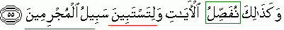 Root: ف ص ل Separate, divide, put apart a thing from another thing; the limit or boundary formed, a separation between the two lands; a separation that will reflect that the former has come to an end; distinguish and make two things distinct from each other. It demarcates the position/location of a thing/place which results in its highlighting/making apparent/visible/vivid/ defined/determined. Root: ب ى ن Separate, severe, disunite or cut off, distanced from one thing, to become apparent, manifest, evident, clear, plain, perspicuous, become known, distinguished. The way one pursues; Root: ج ر م criminal, erroneous behavior/conduct. This is contrary /antonym of المسلمين. {Refer 68:35} It is about the conduct, the way one follows, system, procedure, law. It is about practical conduct not theoretical belief.