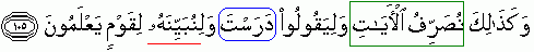 so that people may say " The purpose of نُصَرِّفُ is made evident/reflected by the word "دَرَستَ". In good old days, people used to put the crop {wheat for example} in the field and then an animal used to walk in a circle to separate wheat grain from the plant. This was called "د ر س" by the Arabs. The rotating {centrifuge} of thing not only helps segregate two things but it becomes visible from all angles. Seeing one thing repeatedly from the same angle does not introduce that thing to the viewer from all angles. Repetition is the essence of publicity, since the objective is to inculcate in the mind of people only one aspect of the thing, whereas the objective of نُفَصِّلُ and نُصَرِّفُ is to make people perceive things distinctly and know them from every angle and aspect.